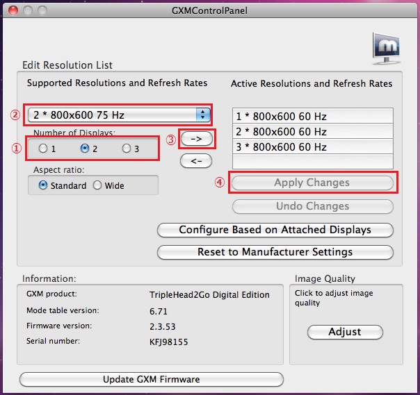 “Active Resolutions and Refresh Rates”に画面番号と解像度がセットされます。