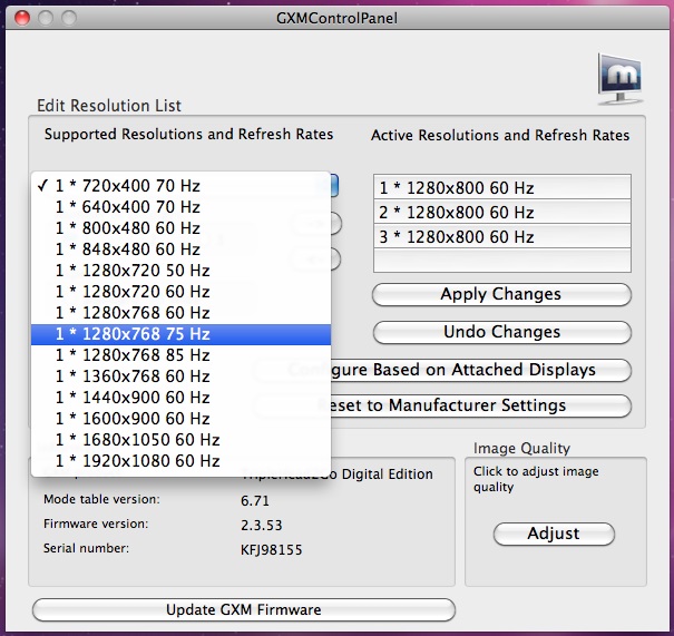 “Open Matrox GXM Control Panel”画面で1280×800の設定を3台分したのですが、