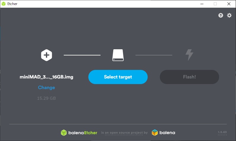左アイコンでminiMadのシステムイメージを指定、真ん中アイコンでSDカードを選択して、右アイコンで初期化を開始します。