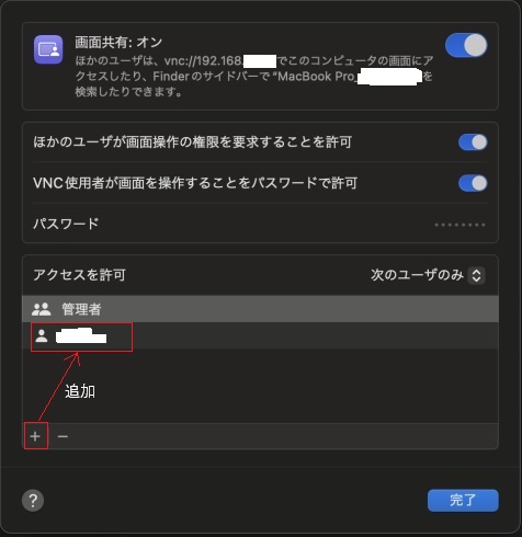設定した点は、画面共有のアクセスを許可にユーザーを追加。