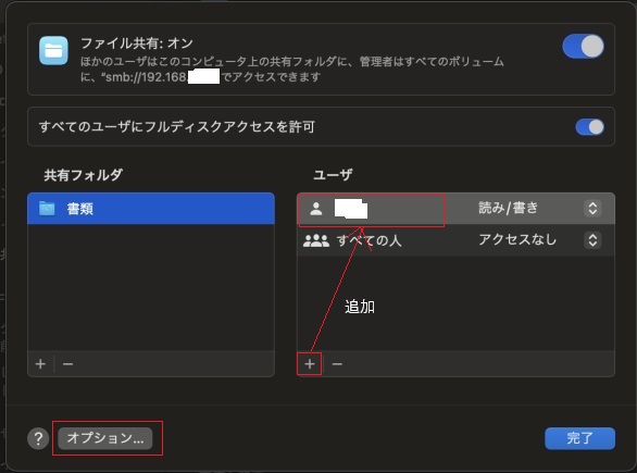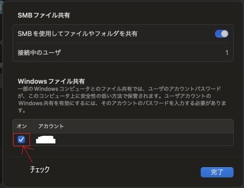 "WIndowsファイル共有"のところに先ほど追加したユーザー名が追加されているので、レ点をいれます。
